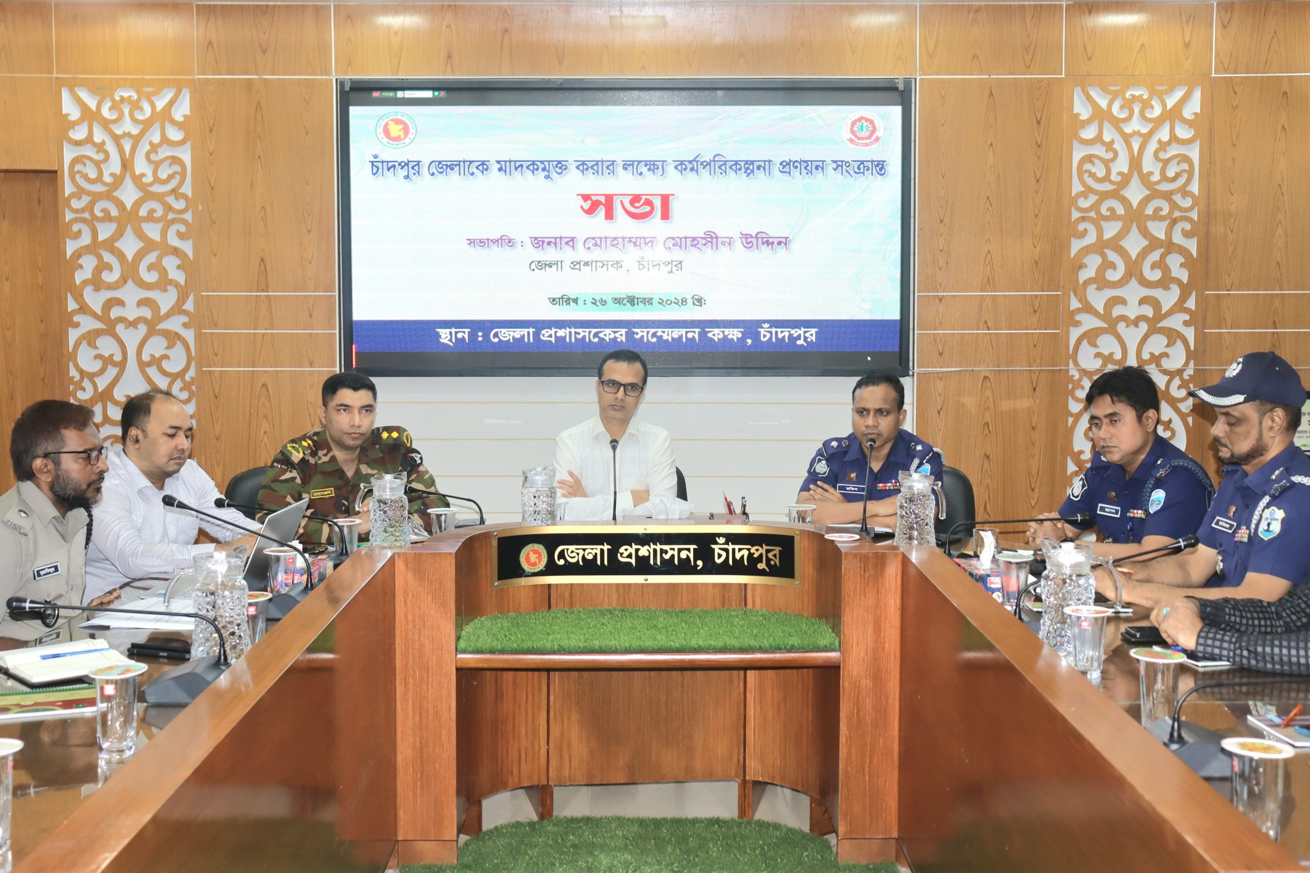 চাঁদপুর জেলাকে মাদকমুক্ত করার লক্ষ্যে ২৬ অক্টোবর শনিবার কর্মপরিকল্পনা প্রণয়ন সংক্রান্ত বিশেষ সভা অনুষ্ঠিত হয়েছে। সভায় সভাপতিত্ব করেন, চাঁদপুর জেলার জেলা প্রশাসক ও জেলা ম্যাজিস্ট্রেট মোহাম্মদ মোহসীন উদ্দিন। এ সময় উপস্থিত ছিলেন লে: কর্ণেল মো: মোয়াজ্জেম হোসেন পিএসসি, অধিনায়ক, ২১ বার, বাংলাদেশ সেনাবাহিনী, চাঁদপুর জেলার পুলিশ সুপার মুহম্মদ আব্দুর রকিব, পিপিএম, অতিরিক্ত পুলিশ সুপার (ক্রাইম এন্ড অপস) রাশেদুল হক চৌধুরী, অতিরিক্ত জেলা ম্যাজিস্ট্রেট একরামুল ছিদ্দিক, নৌ- পুলিশের সহকারী পুলিশ সুপার ইমতিয়াজ আহম্মেদ, যুগ্ম পরিচালক, এনএসআই, মাদকদ্রব্য নিয়ন্ত্রণ অধিদপ্তরের উপপরিচালক মোহাম্মদ মুস্তাফিজুর রহমান, জেলার সকল উপজেলা নির্বাহী অফিসার, অফিসার ইনচার্জ, কোস্টগার্ড, রেলওয়ে পুলিশ, ডিজিএফআইসহ অন্যান্য সংশ্লিষ্ট অংশীজন।