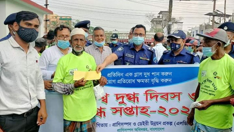 গতকাল মঙ্গলবার থেকে শুরু হয়েছে বিশ্ব দুগ্ধ দিবস ও দুগ্ধ সপ্তাহ দিবস পালন। চাঁদপুরেও জেলা প্রানি সম্পদ অফিসের উদ্যোগে সপ্তাহটি শুরু করা হয়। এ উপলক্ষে তারা জেলা প্রশাসকের সভাকক্ষ ছাড়াও একটি অনুষ্ঠান করে জেলা পুলিশ সুপারকে নিয়ে। সেখানে ট্টাফিক পুলিশ বেলা সাড়ে ১১টার পর থেকে ১৩৭ রিক্সাচালককে হাজির করা হয়। দেখা গেলো জেলা প্রাণিসম্পদ কর্মকর্তা মাত্র ২শ ৫০ গ্রাম (এক পোয়া) দুধের ১০০টি প্যাকেট নিয়ে এলেন। এটি দেখে একরকম অস্বস্তিবোধ করতেই দেখা গেলো অনুষ্ঠানের প্রধান অতিথি পুলিশ সুপার মিলন মাহমুদকে। এদিকে রিক্সা চালকদের সময় গড়িয়ে গেলো ৪০ মিনিটেরও বেশি। পুলিশ সুপার লক্ষ্য করলেন এ সামান্য দুধ দিয়ে তাদের কি হবে! এসময় তিনি সিদ্ধান্ত নিলেন, প্রতিজন চালককে ১০০ টাকা করে দেবেন। তড়িৎ সিদ্ধান্ত নিয়ে তিনি ১০০ টাকা ও সবার জন্য মাস্কের ব্যবস্থা করে দুধ বিতরণে গেলেন।