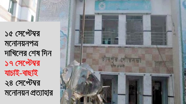 আসন্ন চাঁদপুর পৌরসভার নির্বাচন আগামী ১০ অক্টোবর অনুষ্ঠিত হতে যাচ্ছে। নির্বাচনে বিএনপি অংশগ্রহণ করবে। নির্বাচনে মেয়র পদে দলীয় মনোনয়ন ইচ্ছুদের দলীয় কার্যালয়ে এসে দলীয় মনোনয়ন ফরম সংগ্রহ করার জন্য অনুরোধ জানানো হচ্ছে। আগ্রহী প্রার্থীগণ ৬ ও ৭ সেপ্টেম্বর বিকাল ৫টা থেকে রাত ৮টা পর্যন্ত মনোনয়ন ফরম সংগ্রহ করতে পারবেন। মনোনয়ন ফরম জমা দেওয়ার শেষ তারিখ ৮ সেপ্টেম্বর বিকাল ৫টা থেকে রাত ৮টা। জেলা বিএনপির যুগ্ম আহ্বায়ক মাহবুব আনোয়ার বাবলু ও যুগ্ম আহ্বায়ক মুনির চৌধুরী মনোনয়ন ফরম বিতরণ ও জমা নিবেন। ফরম সংগ্রহ করতে অবশ্যই আপনার ২ কপি পাসপোর্ট সাইজ রঙিন ছবি, জাতীয় পরিচয় পত্রের ফটোকপি ও ভোটার ক্রমিক নং সাথে নিয়ে আসতে হবে। চাঁদপুর জেলা বিএনপির যুগ্ম আহ্বায়ক মাহবুব আনোয়ার বাবলু স্বাক্ষরিত এক পত্রে এ তথ্য জানানো হয়।