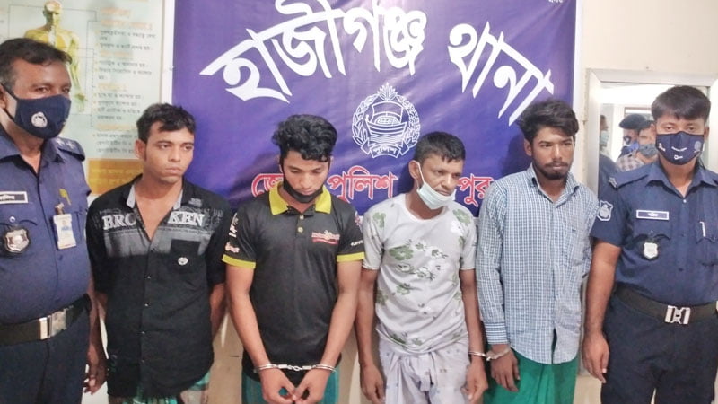 আটকৃতরা হলেন, হাজীগঞ্জের মকিমাবাদ মল্লিক বাড়ীর রেনু মিয়ার ছেলে জাহাঙ্গীর আলম (৪৫), ও একই এলাকার মল্লিক বাড়ীর জাহাঙ্গীর আলমের ছেলে শাকিব (২০), কুমিল্লার চান্দিনা সুরিখোলা এলাকার মন্টু মিয়ার ছেলে সজিব (২৬), মতলব দক্ষিন গাবুয়ার হারনের ছেলে শরিফ (২৭)।